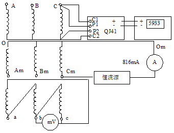 (2)把高、低压绕组串联起来通电流测量,采用同相位和同极性的高压绕组助磁。由于高压绕组的匝数远比低压的多,借助于高压绕组的安匝数,用较小的电流就可使铁心饱和。